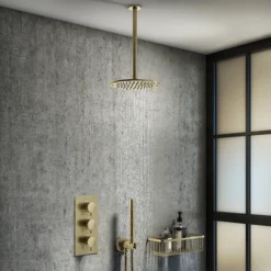 Arezzo Brushed Brass Round Thermostatic Shower Pack With Ceiling Mounted Head + Handset