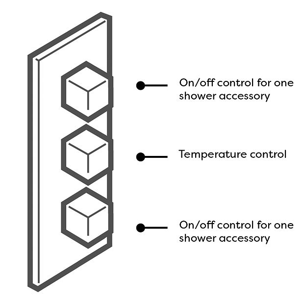 Offers thermostatic showering via three easy-to-operate controls. Separate controls for temperature and flow. Operates two outlets separately or simultaneously.