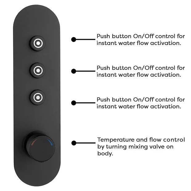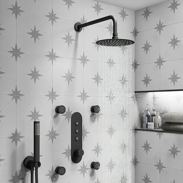 Bring elegance to the modern bathroom with this Arezzo Matt Black Industrial Style Push Button 3 outlet complete shower. The package includes a concealed push button shower valve with integrated diverter, handset, fixed overhead shower head and 4 round body jets. The stylish concealed shower valve offers thermostatic showering via three easy-to-operate controls, operates two shower accessories separately or simultaneously and diverts to a third option. The solid brass construction makes the valve durable and quick to clean thanks to the smooth finish. The ideal solution for multi-option showering.