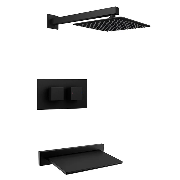 Arezzo Square Matt Black 2 Outlet Shower System (Fixed Shower Head + Slimline Waterfall Bath Spout)