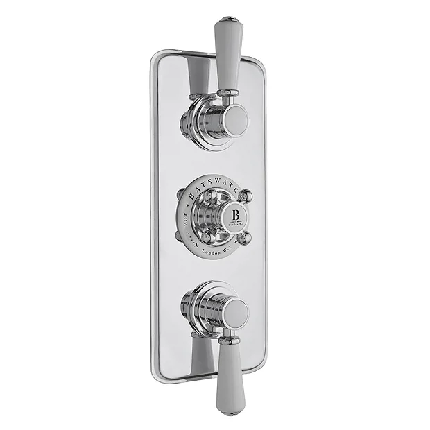 The Bayswater White Triple Concealed Thermostatic Shower Valve with Diverter combines the elegance of traditional styling with the precision and technology of modern day design. Manufactured from solid brass and beautifully finished in chrome to the highest quality. The shower valve can be used on all types of water systems and offers full thermal protection to prevent scalding in the event of hot or cold water shut off. The built-in diverter allows 2 outlets to run separately or simultaneously and diverts to a third.