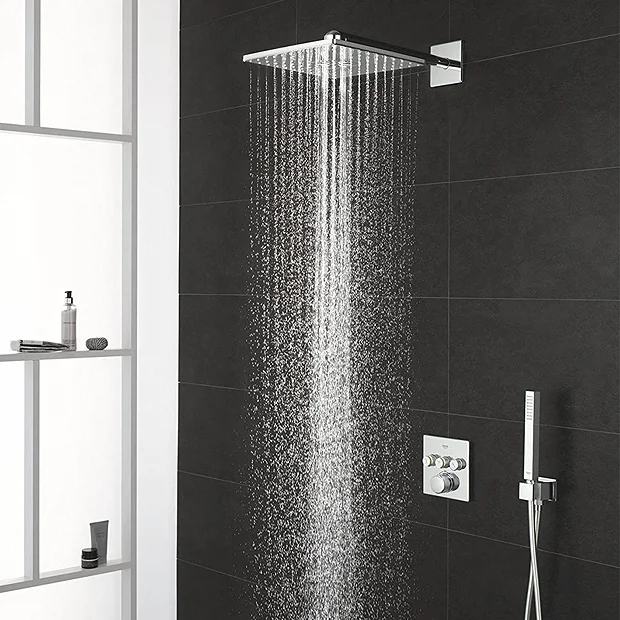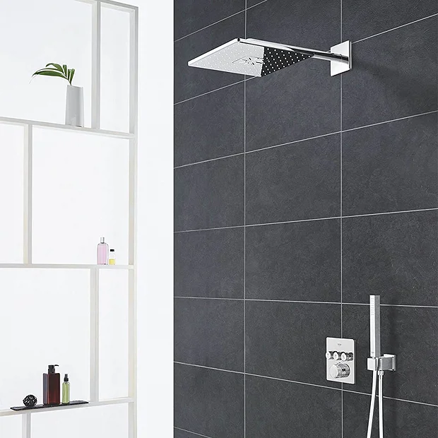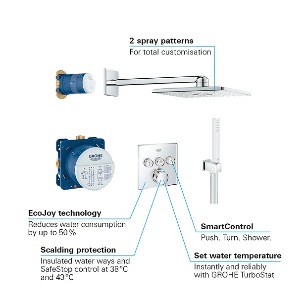 Take full control of your washing regime with the Grohe Grohtherm SmartControl Square Perfect Shower Set. Its SmartControl technology allows you to choose the water temperature and intensity from a gentle mist to an invigorating rainstorm. For complete comfort and safety, Grohe TurboStat technology maintains a consistent temperature while the SafeStop button prevents scalding. Plus, its clever CoolTouch system means the shower valve body will never be too hot to touch. This square rainfall shower head has clean, minimalist lines accentuated by the gleaming chrome finish. With rapid installation, you’ll be enjoying your dream shower in no time.